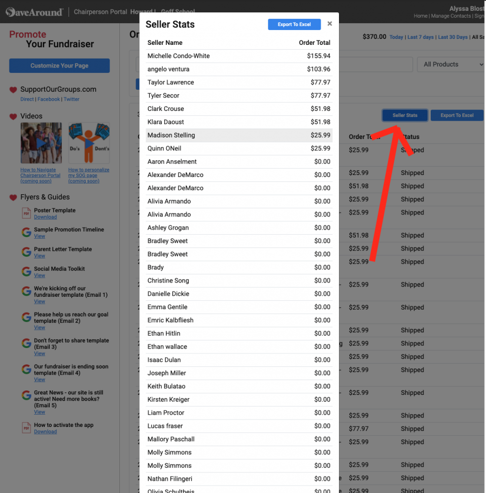 How can you tell if students are registering as sellers and how are they doing in the sale? If you visit the chairperson portal and click the blue button that says “Seller Stats” that will provide you with a list of everyone who has registered and how much they have sold to date. This can be very helpful in knowing if a group needs an “extra push” or some help along the way.  This is also a good benchmark to talk to the sponsor to help them encourage and motivate their students to finish strong.